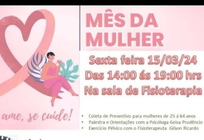 Sexta- feira dia 15 de março de 2024 das 14h às 19h na sala de fisioterapia será realizado coleta de preventivo, teremos palestra, orientações e exercícios pélvicos com os profissionais de saúde para mulheres de 25 a 64 anos.
