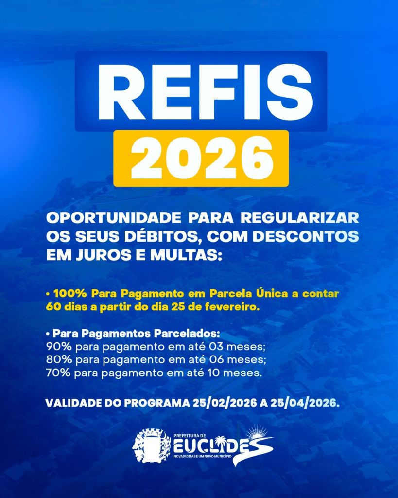 A Prefeitura de Euclides da Cunha Paulista informa que o Programa de Regularização Fiscal – REFIS 2026 já está em vigor, oferecendo condições especiais para que contribuintes — pessoas físicas e jurídicas — regularizem débitos municipais com descontos em juros e multas.